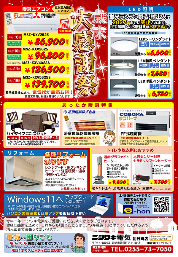 暖房エアコン、LED照明など、お得にお求めいただけるチャンスです。